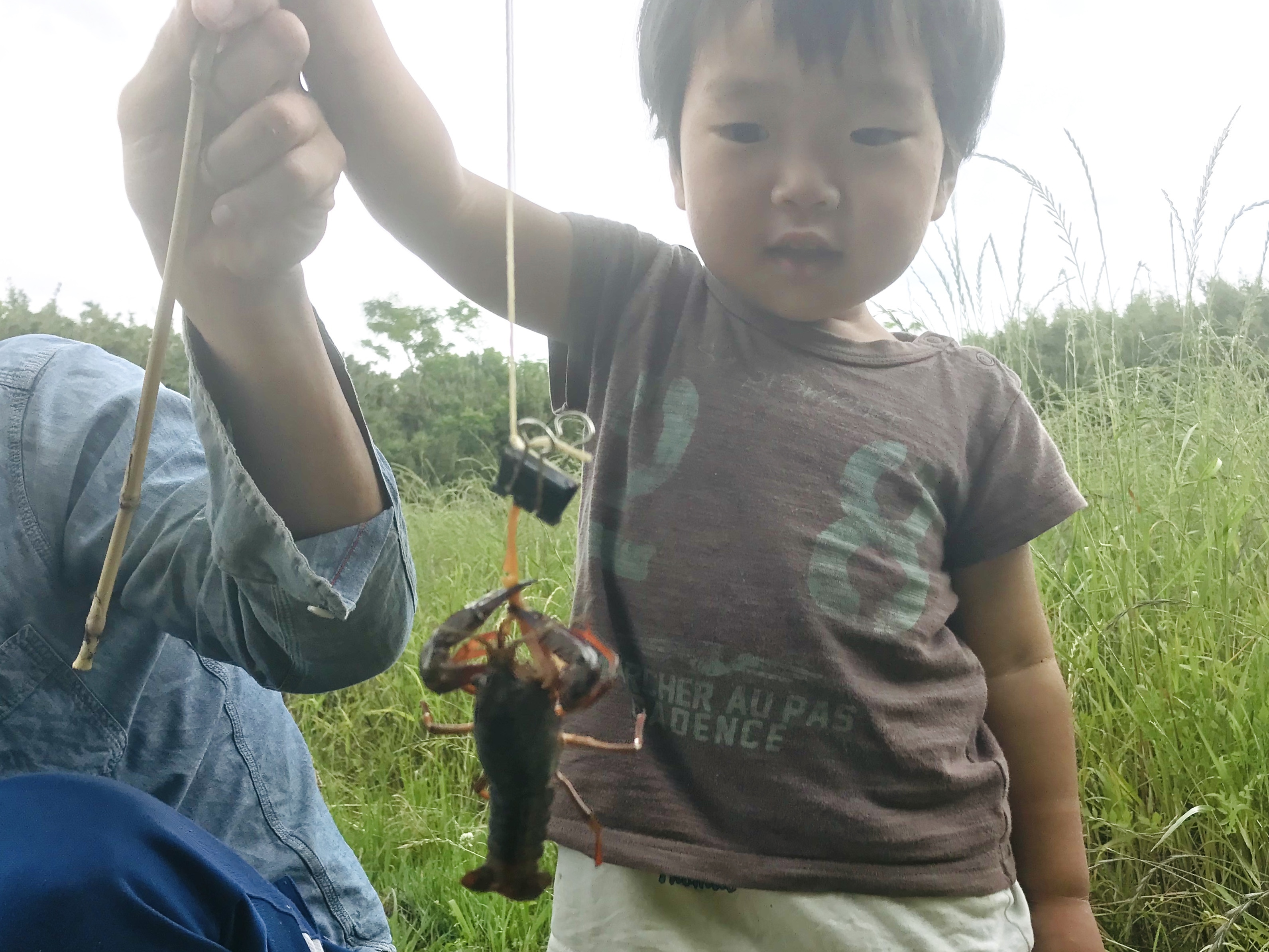 ザリガニ以外にも、カニ、カエル、バッタ、運がよければキジやウサギにも出会えます。