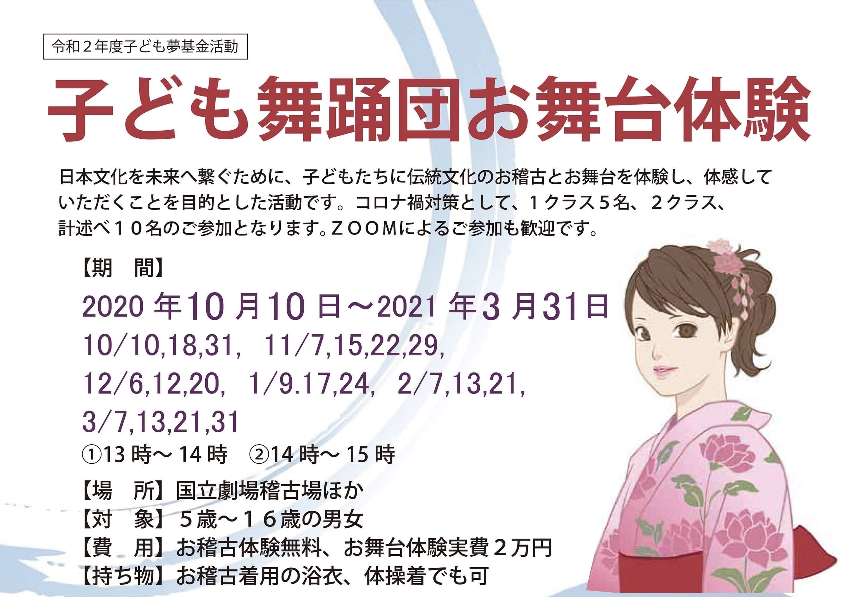 お子様に日本文化のお稽古から、お舞台体験までのプログラムになります。日本舞踊、剣舞を学びます。2020/10/10〜2021/3/31 の期間全20回 対象 5歳〜16歳の男女 場所 国立劇場稽古場 赤坂会館 少人数制 マスク消毒 体調管理 ソーシャルディスタンス徹底①浴衣若しくは運動着に着替えます。②ご挨拶③日本舞踊体操で、身体を整えるトレーニングをします。④お道具を持って基本の舞踊を踊ってみます。⑤剣舞の基本を学びます。