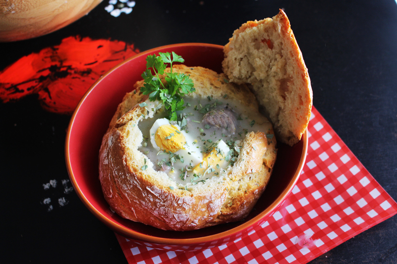 発酵ライ麦、マジョラム、肉のスープです。味を引き立たせるために、生のニンニクも少し入っています。ゆで卵とソーセージと一緒になんと焼きたてのパンをお皿にしてお出しします。パン(お皿)の中身をスプーンで崩しながらスープと一緒に召し上がります。しかし、早食いにご注意!気を付けないと自分のお皿に穴が開いてスープが漏れてしまいますので、丁寧に丁寧にジュレックを食べましょう。