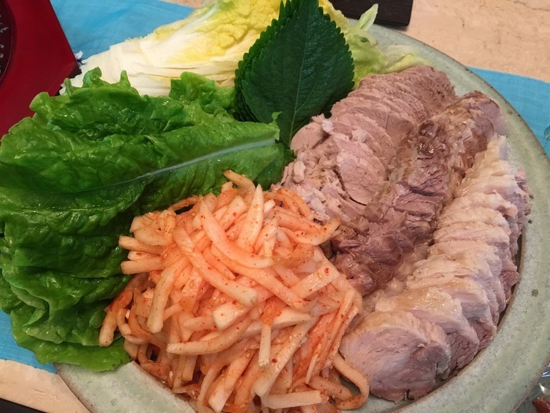 豚塊肉を蒸し、野菜で巻いて食べる料理です。大根の即席キムチとアミの塩辛のたれでさっぱりと食べることが出来ます。