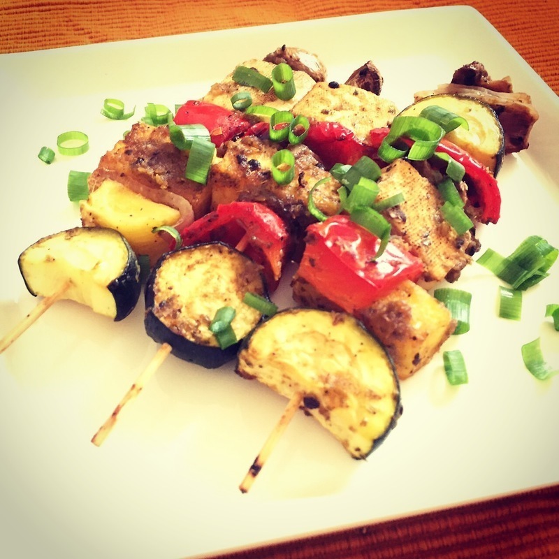 Tofu, fresh pinapple chunks, zucchini, chestnut mushrooms, red peppers and onions marinated in homemade Jerk sauce made with authentic Jamaican herbs and spices.