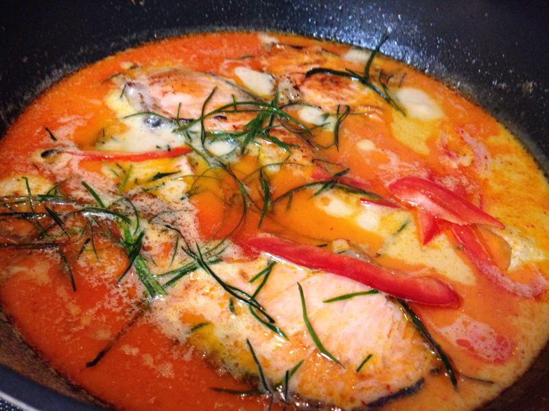 グリルサーモンにレッドカレーココナツミルクソースをかけて、こぶみかんの葉と唐辛子を添えて、ジャスミンライスと一緒に頂きます。