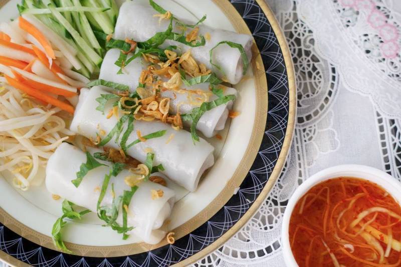 ライスペーパーの上にエビやビフンやキュウリ、レタス、もやし等の野菜をたっぶり入って巻く料理で、ベトナム風の味噌とつけて食べる料理です。