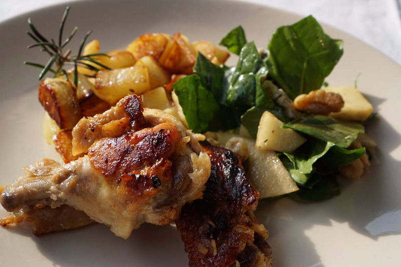 冬の一般的なサラダの一つで、ほうれん草とクルミ、洋梨とゴルゴンゾーラチーズの苦みとフルーツの甘味はとても魅力的。そして、チキンとじゃが芋にバランス良く合います。洋梨が無い場合はりんごを使います。