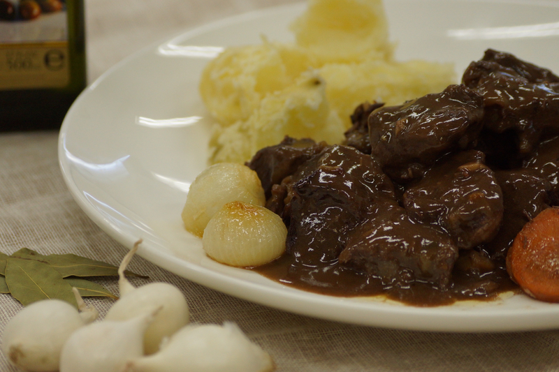 家庭料理の定番。牛肉を赤ワインでじっくりと煮込みます。