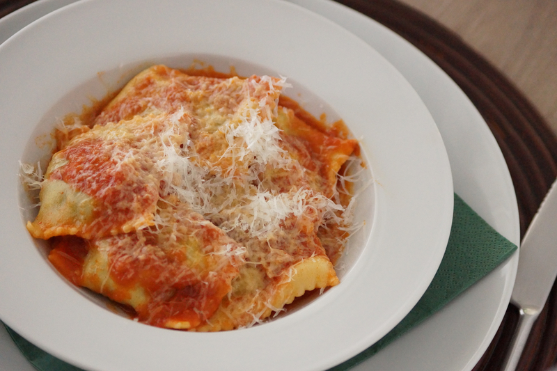 === Ravioli di ricotta e spinaci al sugo(手作りほうれん草ラビオリトマトソース)