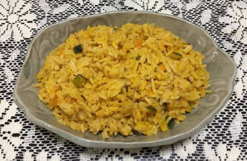 Rice cooked with sautéed onions, pumpkin and garlic and other in coconut milk.