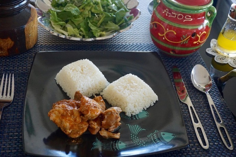 White rice cooking with garlic, olive oil and salt. Red beans is a pottage seasoning with coriander, garlic, onion, salt and butter. Braised chicken is cooking with some species like coriander, oregano, also adding some salt and tomato sauce, to make a delicious sauce.