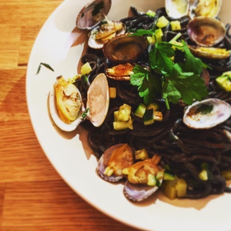 === Black pasta with seafood (vongole or shrimps)(イカスミパスタ(ヴォンゴレかえび))