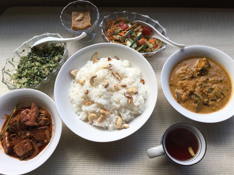 このメニューは普段スリランカ人が食べるメニューです。栄養バランス、色のバランス、味のバランスをたっぷりと使った料理です。小さいときからいっも食べていた