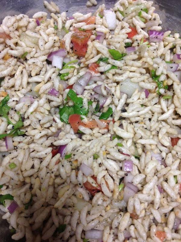 This is a rice puff mixed with onions, potato, tomato, coriander leaves, lemon, salt, oil, mango powder, sesame powder. If you like hot, spicy, and sour taste, you will gonna like it.