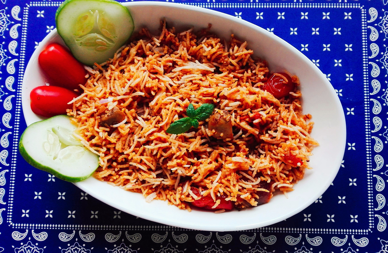 Rice cooked with mushrooms and a Biryani masala with some yogurt to add a bit of tangy flavor.