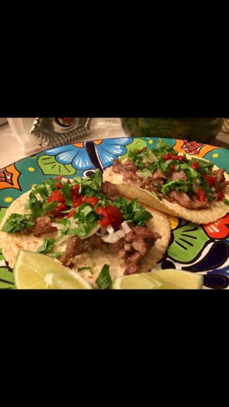 Fresh handmade corn tortillas cooked and fried in oil then filled with beef or chicken with chopped onions , corriander and salsa and avocado as you like .
