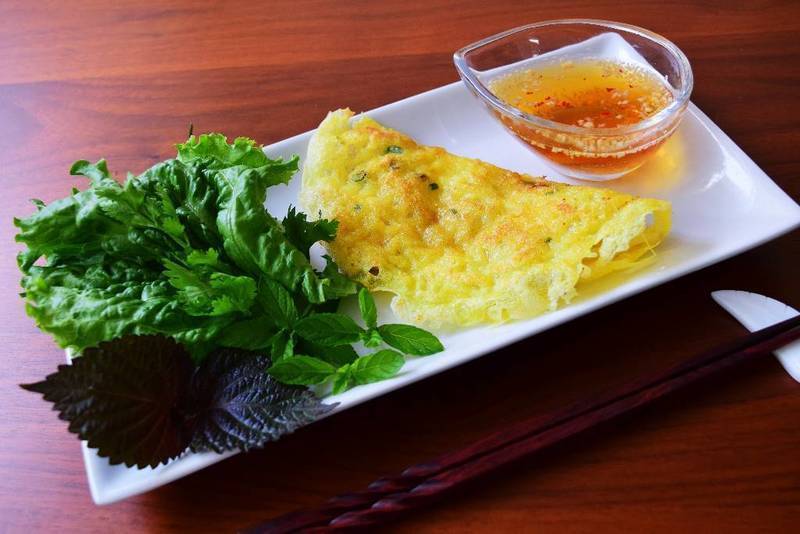 ベトナムのクレープと呼ばれていますが卵、小麦粉を使わないです。米粉、ココナッツミルク等入りの生地、薄くぱりぱりに焼かれます。中身はもやし、豚肉、海老等