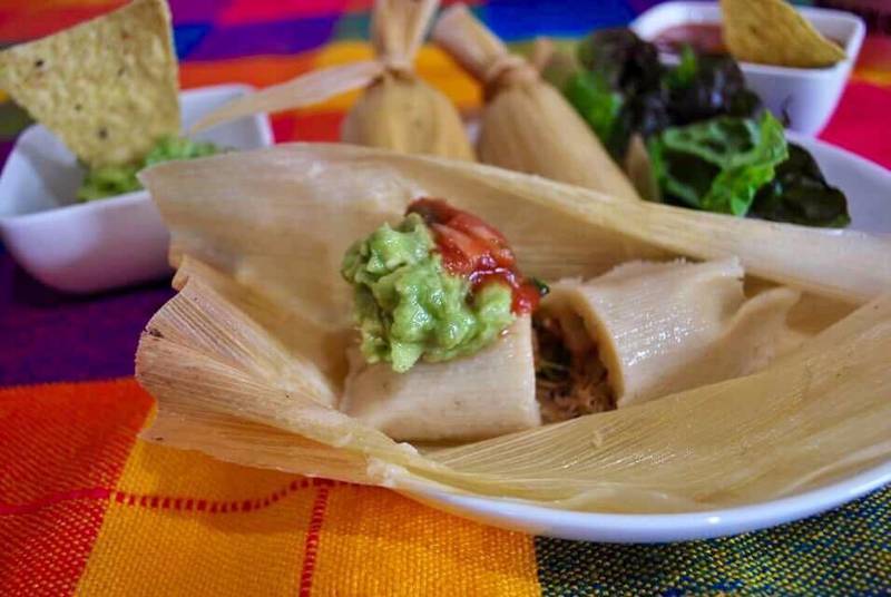 A traditional dish made of corn flour steamed in a corn husk filled with chicken.