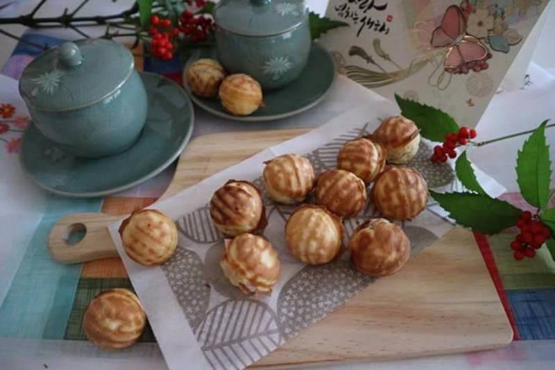 韓国のくるみ饅頭を生地から作り、みんなで自分の分を焼きます。一人20個ぐらい焼きますので、お持ち帰りしていただけます。