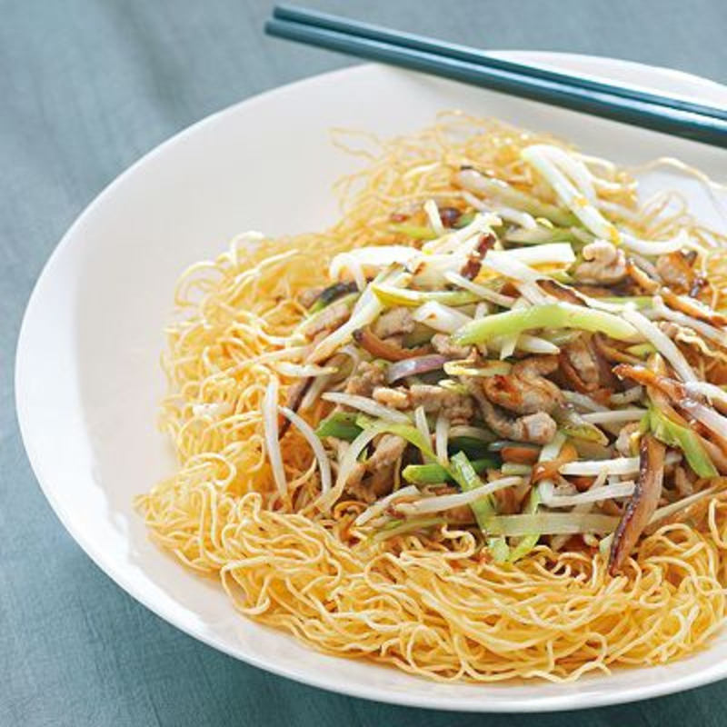 カリッカリ焼いた香港麺に、豚肉、椎茸、もやし、(黄)にら、ねぎのあんをかけて、クランチの麺ととろっとろのあんは絶妙の食感!