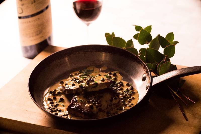 150 gram Tender Aussie Fillet Steak Seared Medium Rare served with Fresh Green Peppercorn Cream Sauce.・150グラムのオージーフィレステーキをミディアムレアに焼き上げ、青胡椒のクリームソースで仕上げました。