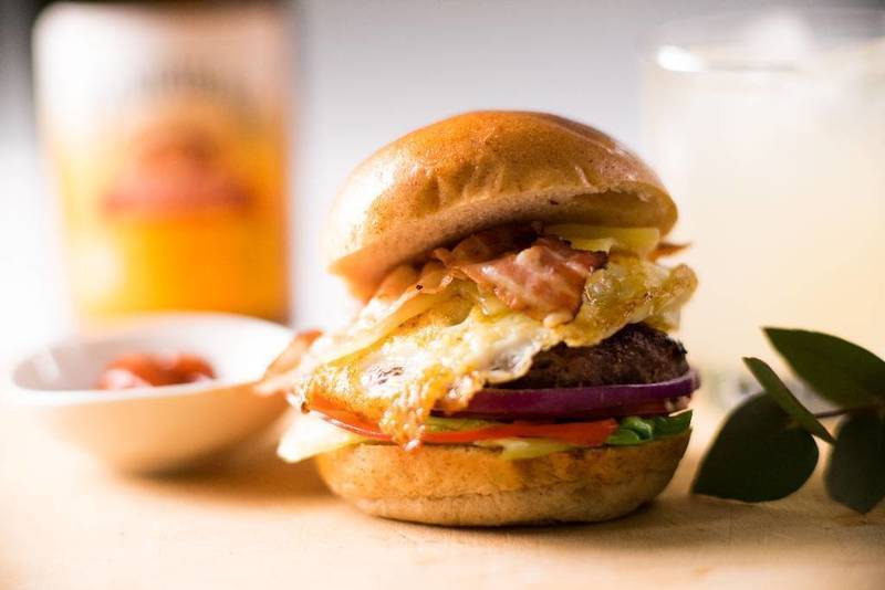 Ground kangaroo patties with a special sauce, lettuce, onion, capsicum, egg, smokey bacon, tomato, beetroot, and herbs.・カンガルーの挽肉のパテをスペシャルソース、レタス、玉ねぎ、ピーマン、卵、燻製ベーコン、トマト、ビーツ、そしてハーブとともに。