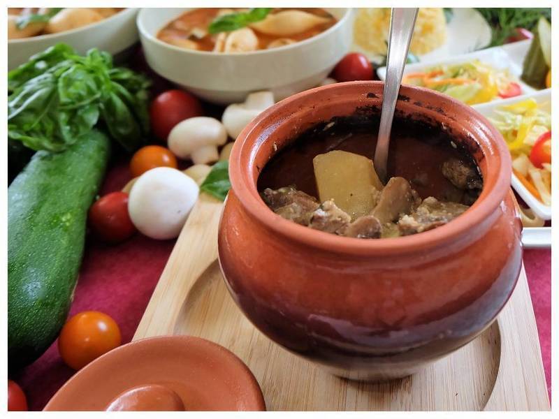 ビーフときのこ、ジャガイモのホワイトソースのつぼ焼き。ロシアの伝統料理。