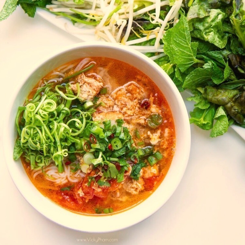 Bun rieu is a light rice vermicelli soup flavoured with tomatoes, topped with rice paddy field crabs, tofu and seasonal green leafy vegetables. Finished with a squeeze of fresh lemon juice.