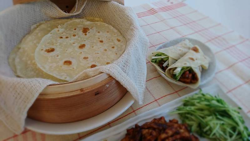 クレープみたいで、薄餅の一種、中国北方の伝統的な料理。もっちり、極薄!肉や野菜を巻いて食べます。北京ダックを巻いてる生地と同じ物ですよ!