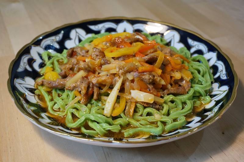 ズベキスタンの西部ホレズム地方の麺料理。 緑で味付けされた栄養満点でヘルシーな麺を小麦粉から捏ねて手作りします。 スープはトマト風味の野菜たっぷりスープ。 ウズベキスタンでもなかなか食べれないレア料理を今回はご紹介します。