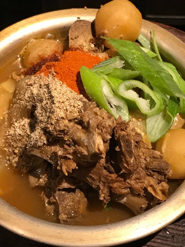 豚の背骨やじゃがいも、ウゴジ(白菜の外葉)、えごま、ごまの葉、にんにくなどを入れて煮た辛口の鍋料理。濃厚で深い味わいのスープが特徴です。