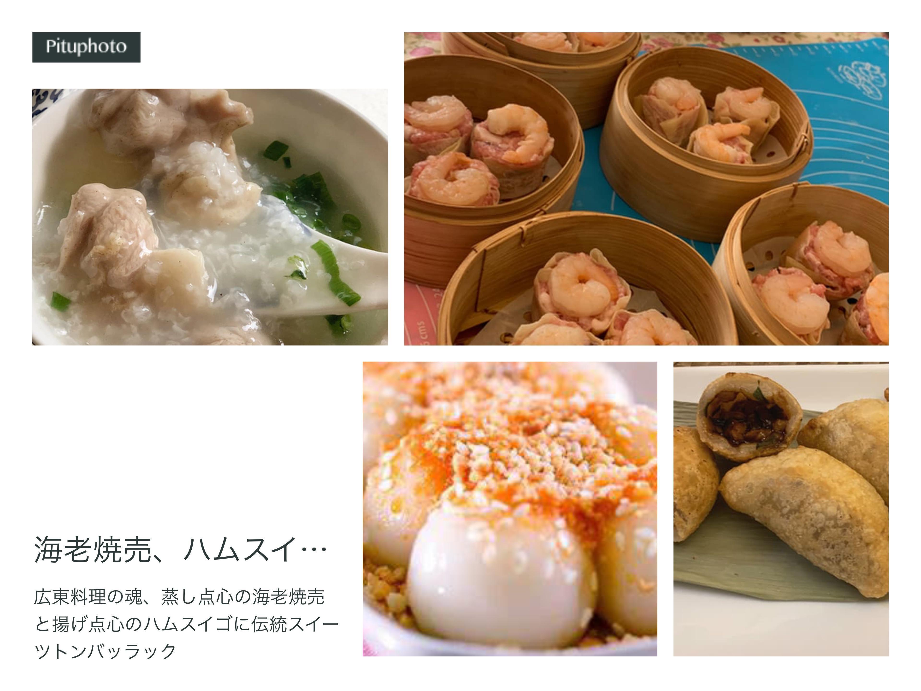 この度点心とお粥まで一緒に作って食べる欲張りメニューを作りました!香港の飲茶が好き、点心とお粥も好きな方に是非お越しください!【レシピ】=== 飲茶の番茶プーアル茶(普洱茶)飲茶で必ず注文する番茶です。ダイエット効果が期待できると言われています。また、この脂肪の吸収を抑制することで、ダイエット効果ばかりではなく、高血圧、心臓疾患、脳卒中などの生活習慣病の予防にもつながります。=== 香港定番揚げ点心咸水角(ハムスォイゴッ(もちっと香ばしい揚げ餃子)))外側パリッと生地がもちもち、中味が香ばしく干しエビ干し椎茸などの香ばしいタネを包んだ香港地元なら定番の揚げ点心です。=== エビ入り焼売(鮮蝦燒賣)飲茶に欠かせない点心です!本場はエビ入りですよ!=== トンバッラック(糖不甩)手作り白玉にピーナッツ、胡麻とココナッツファインをたっぷりかけたデザートです。=== 香港粥の王道—鶏粥(秘製雞粥)香港地元では必ず注文するお粥です、飲茶だけではなく夜中に夜食を食べるほど人気なお粥です!