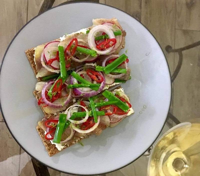Depending from seasons. It could be toast with home made marinade sardine, or home made ham.