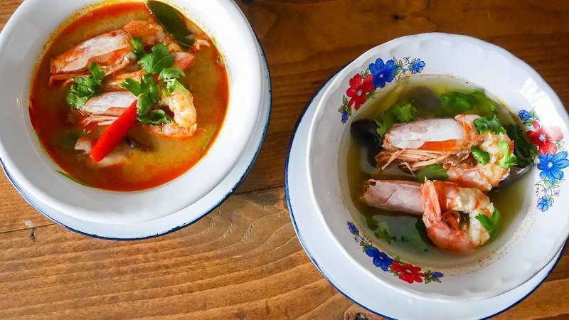 日本のタイ料理店でもお馴染みの赤いトムヤムクンと、クリアスープのトムヤムクンの2種類を食べ比べます。酸味と辛味が特徴的なスープですが、ハーブを使って出汁を取るところから作って上品な味に仕上げます。サラダもえび入りというエビ尽くしのメニューです。