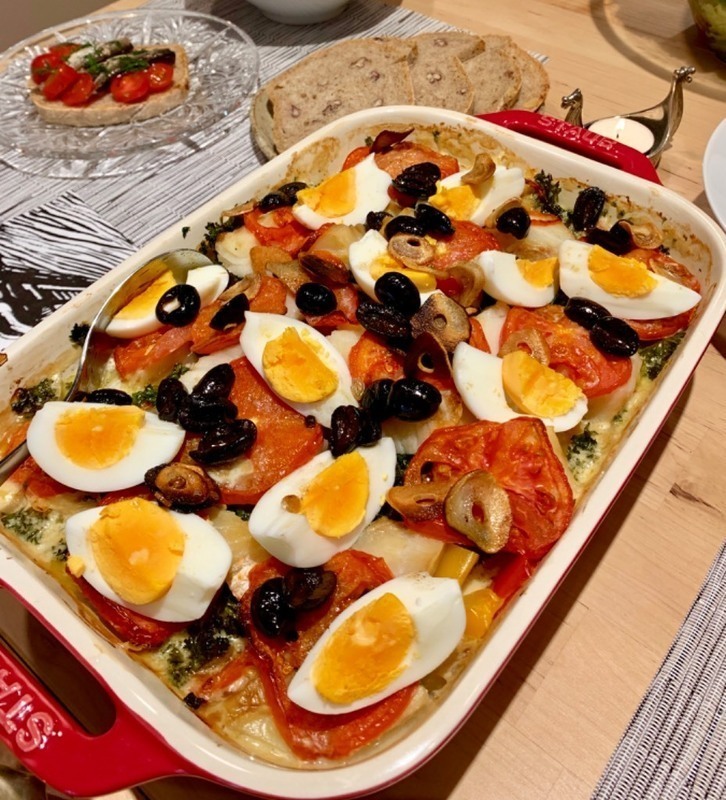 たくさんの野菜と一緒にオーブン焼きをしたバカリャウ、中にクリームとバターソース、ガーリックとブラックオリーブのフライトッピング