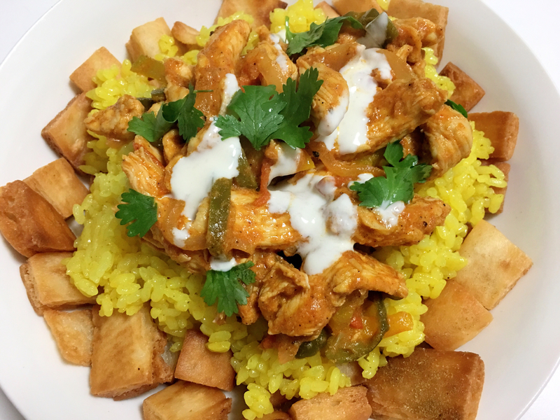 Fetat Shawarma is a Famous Middle Eastern dish of Chicken with Vegetables and Yellow rice.