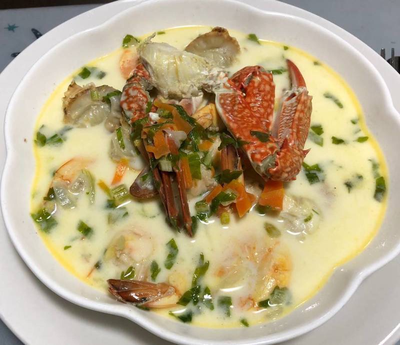 パターで新鮮なシーフードミックスを炒めたら、野菜、クリーム、スパイスを添えます。大人気のスープです。