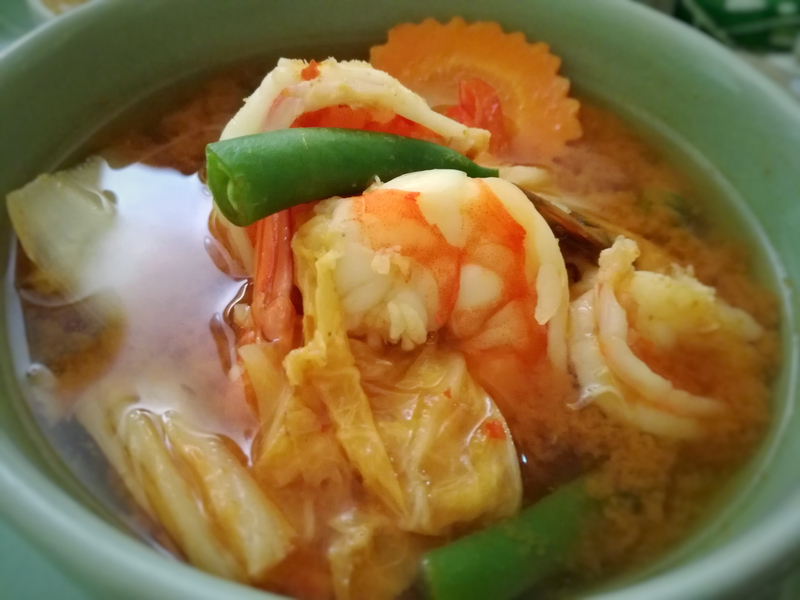 コナッツミルクが入っていないすっぱ辛い味付けのカレーです。海老、白身魚、青パパイヤ、大根、人参、いんげんなど野菜がたっぷり入っているさっぱりしたヘルシーな料理です!
