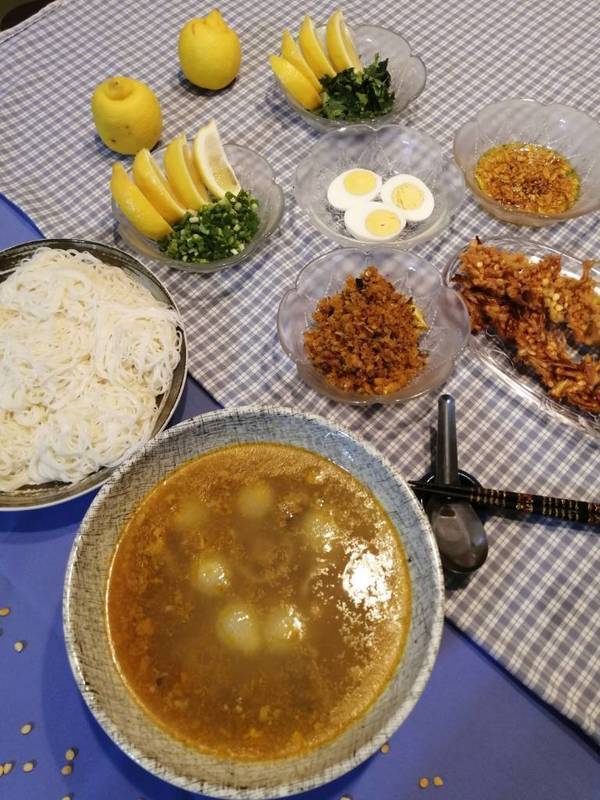 鯛とレモングラス、ひよこ豆等で魚介スープを作り、素麺にかけて食べるミャンマーの国民的な料理