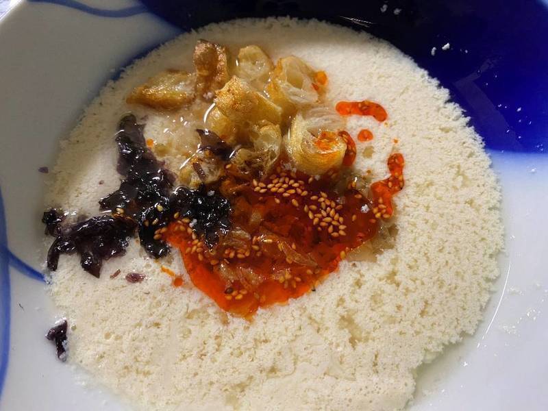豆から作り、しょっぱい味の豆乳です。干しエビ、ザーサイ、揚げパン、岩海苔などを載せ、まろやかな豆乳です。