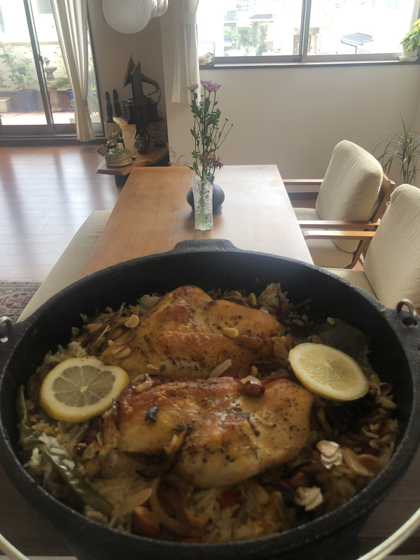 サウジアラビアの南方の料理で、チキンと炊き込みご飯をじっくりオーブンで焼き、炭の香りをにじみ込ませ、仕上げに炒めたアーモンドと松の実を添えた料理です。