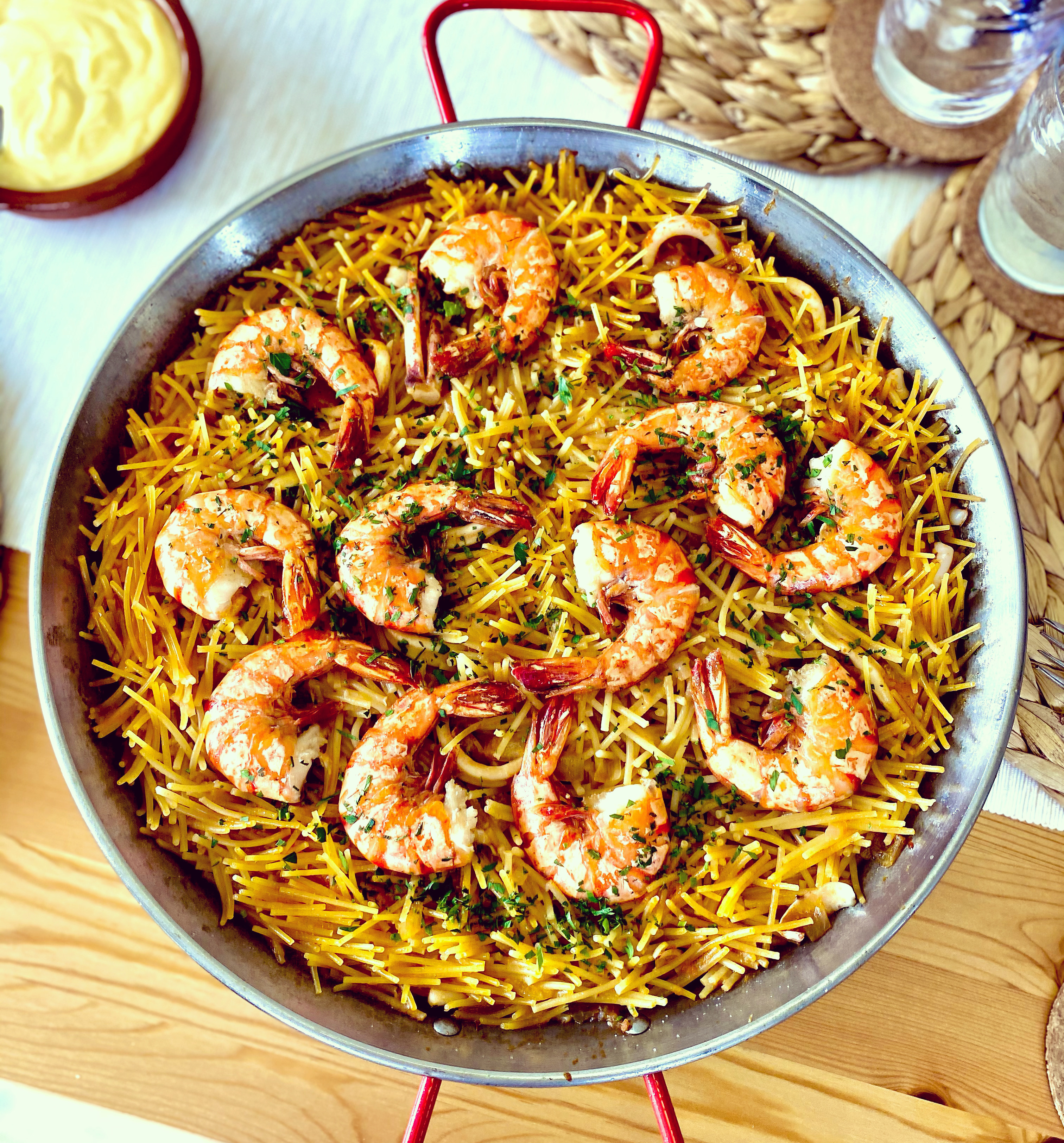 Seafood pasta dish cooked in a paella pan served with aioli sauce. It’s very famous in the Spanish Mediterranean coastline.