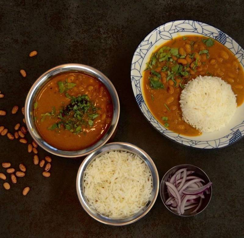 A vegetarian dish consisting of red kidney beans in a thick gravy with many Indian whole spices, and is usually served with rice.