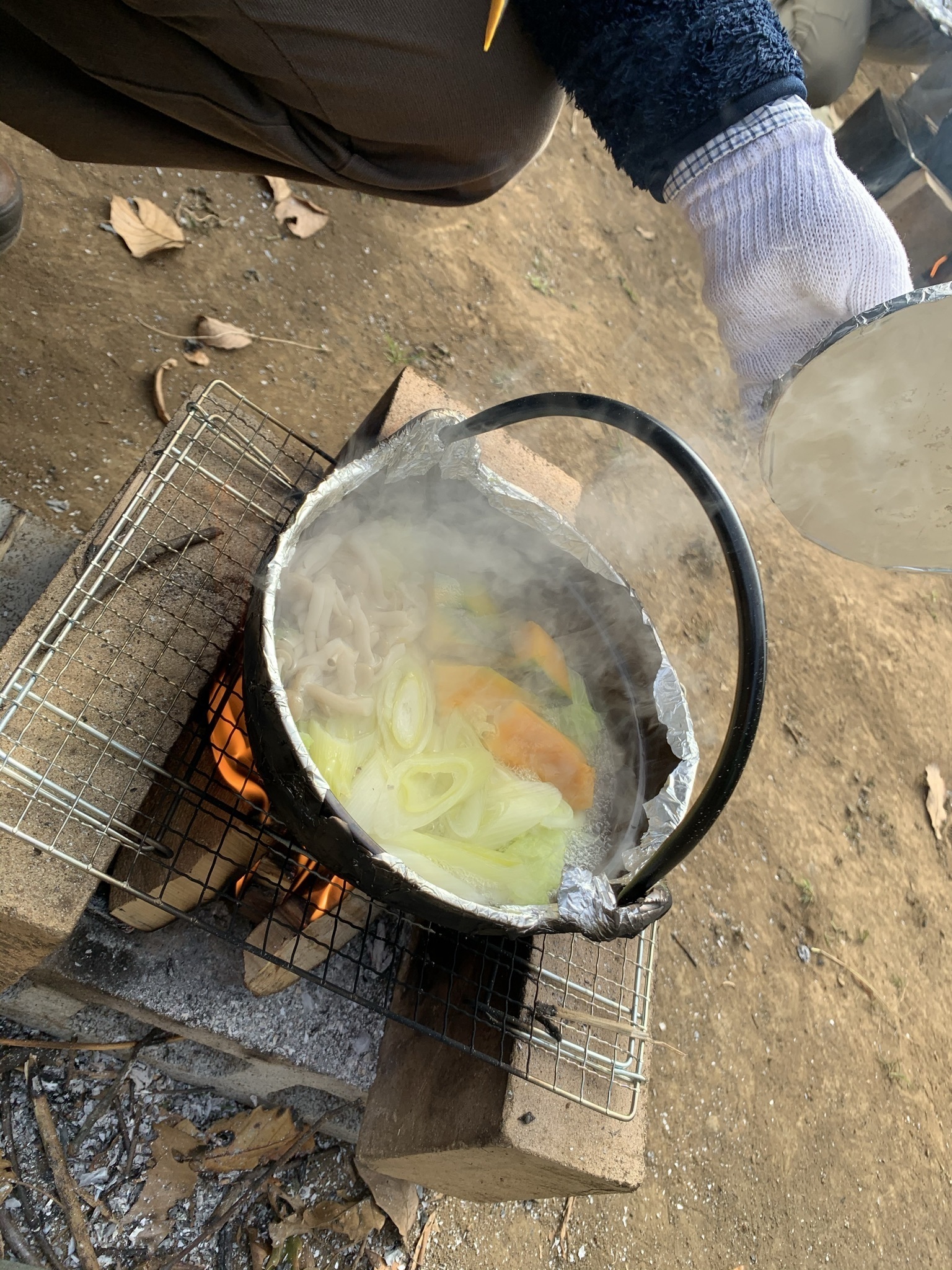 火起こし出来たら、鍋にお野菜と自家製味噌を入れて、ほうとう風うどんを煮る‼︎