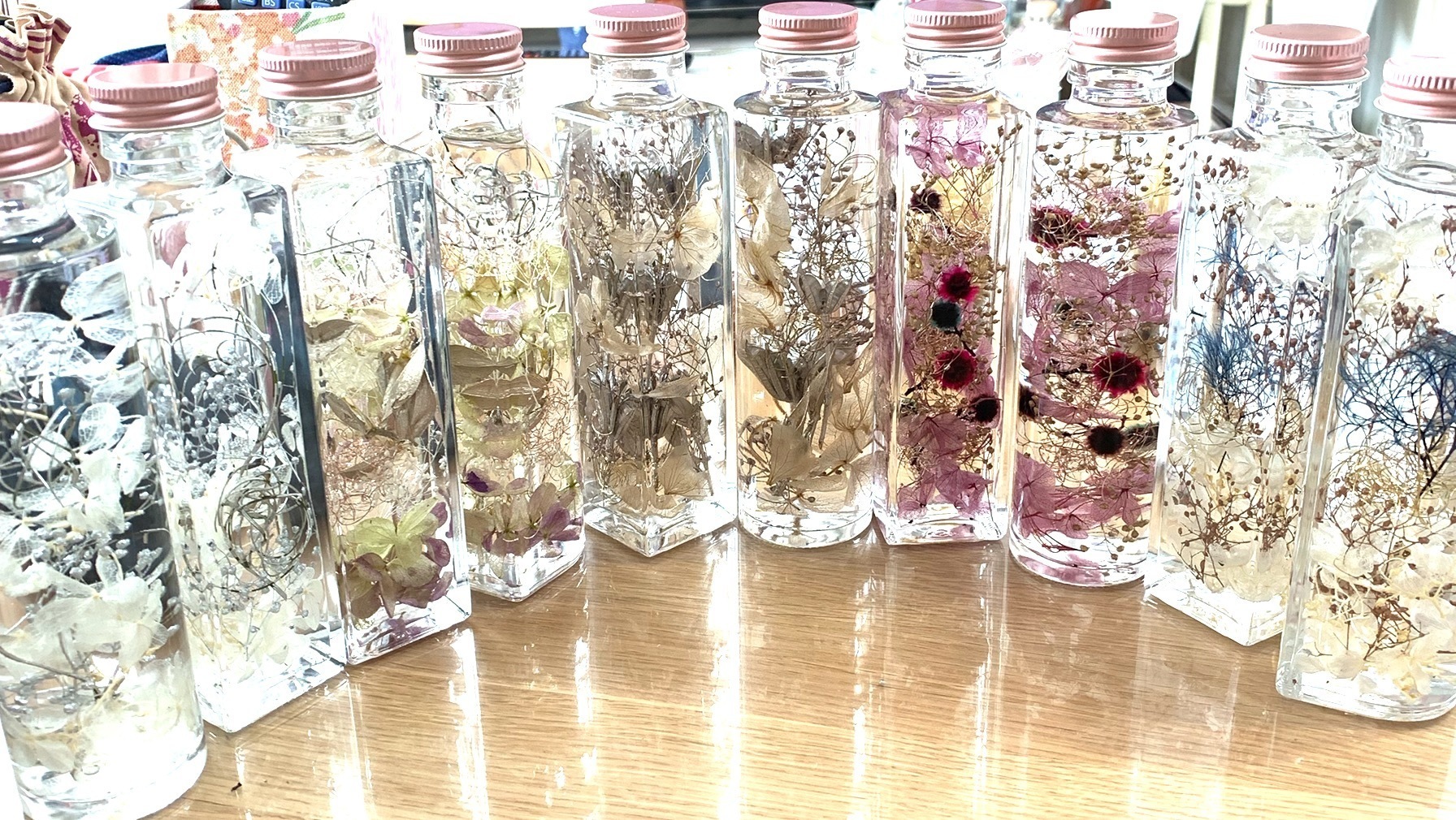 花材の入れ方やオイルの屈折などにより1本ずつ花姿が変わっていきます。