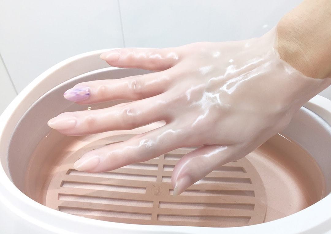 パラフィンパックという温かいロウで、ハンドパックをします。じんわりと芯まで温かくなります。その後、ミトンをつけて頂きます。保湿・美白・血行促進などの効果があります。1000円は片手のお値段です。
