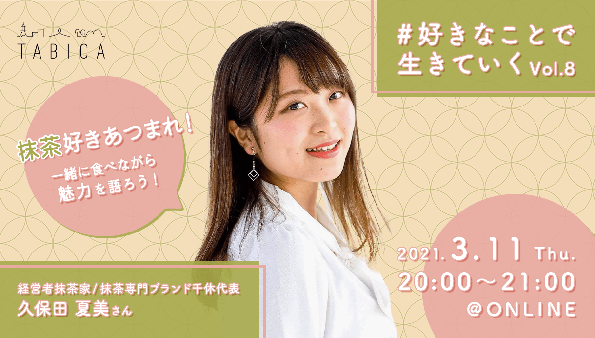 ※定員に達し次第、締め切りますのでご了承ください。※抹茶スイーツの配送は〆切致しました。▼こんなイベントですこのイベントは #好きなことで生きていく を地でいく強者を登壇者にお迎えし、その人の"好き"や"生き方"を一緒に楽しむ、TABICA主催のシリーズイベントです!抹茶好きあつまれ~!今回第8回目は抹茶が好きすぎてご自身で抹茶専門ブランドを立ち上げたツワモノ!!「抹茶家/千休代表 なまっちゃ」こと久保田夏美さんをお招きします~!!もともとはコーヒーや紅茶が苦手で、友達とカフェにいっても飲みたいものがなく、ある日たまたま飲んだ抹茶ラテをきっかけに、どんどんハマっていったというなまっちゃさん!実はオタク気質なところもあり、当時好きだったアイドルが抹茶を好きだったということも、なまっちゃさんの抹茶愛を後押ししたとか!wイベントではなまっちゃさんと抹茶スイーツを一緒に食べながら、抹茶の魅力や商品企画の裏側、こだわり等々をあますとこなく聞いていきます!当日質問やコメントも大歓迎です~!※抹茶スイーツの配送は〆切致しました。▼登壇者久保田夏美/くぼたなつみ。株式会社千休代表。抹茶が好きすぎて抹茶専門ブランド「千休」を立ち上げる。抹茶から、人々が癒しと感謝の時間をつくれることを目指す。抹茶スイーツやドリンクの開発以外に、メディアに出演したり、オリジナルレシピの執筆も。365日抹茶を口にする。▼メッセージ「抹茶が大好き」というところから始まった千休ですが、いろいろな壁にぶつかりながらも起業して3年目をむかえようとしています。千休のカプチーノやフィナンシェを一緒に食べて癒されながら、クローズドだからこそできる話題を中心にお話しできればと思っています!みなさんと"いっぷく"できるのを楽しみにしております!▼参加費1000円▼予約〆切3/11 (木) 19:00▼こんな人におすすめ・とにかく抹茶が好き!・登壇者と直接話してみたい!・同じような仲間と出会いたい!・なんとなくおもしろそう!※どんな方でも大歓迎です!▼当日の流れ・登壇者の自己紹介・さっそく抹茶スイーツを一緒に食べよう!(配送致しました抹茶スイーツをイベント開始までにお手元にご用意を♪)・なまっちゃさんによるこだわりポイントの紹介!・感想のシェアや質問の受付・回答!・みんなで写真撮影して、終了!※抹茶スイーツが手元になくても(食べなくても)参加できます!※内容は変更になる場合があります※撮影した写真はSNS等で使用させていただきます(顔出しが気になる方は写真撮影の際にバーチャル顔フィルターにしていただくか、カメラをオフにしていただいて構いません)▼開催場所Zoomによるオンラインでの開催!※イベントのZoom URLは当日グループチャットにて送らせていただきます!※グループチャットは「右上アイコン→ダッシュボード→グループ」から確認できます^^▼参加の仕方TABICAではホストとゲストのコミュニケーションを大事にしておりますため、イベント中はカメラオンでの参加をお願いしております!Zoomの機能にバーチャル顔フィルターなどもありますので気になる方はぜひご活用ください!▼当日利用するツールZoom(ズーム)について参加される皆様に、事前にZoomのご用意をお願いしております。(1)オンライン会議アプリZoom(ズーム)とは米国に本社を置くオンライン会議サービスです。日本でも多くの企業が利用しています。オンラインセミナーでも利用が多く、ゲストは事前登録なく参加することができます。ツールは日本語対応していますのご安心ください。ツールは無料で利用できます。(2)Zoom(ズーム)のダウンロードリンクについてパソコン(PC/Mac)の場合https://zoom.us/download#client_4meeting「ミーティング用Zoomクライアント」をダウンロードしてください。パソコンの場合はアプリのインストールをしなくてもブラウザのみでも参加ができます。iOSアプリ(iPhone/iPad):AppStorehttps://apps.apple.com/us/app/id546505307Androidアプリの場合:GooglePlayhttps://play.google.com/store/apps/details?id=us.zoom.videomeetings