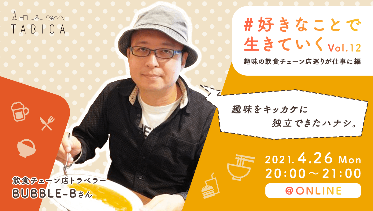 ※定員に達し次第、締め切りますのでご了承ください。▼こんなイベントですこのイベントは #好きなことで生きていく を地でいく強者を登壇者にお迎えし、その人の"好き"や"生き方"を一緒に楽しむ、TABICA主催のシリーズイベントです!今回第12回目は、チェーン店トラベラーのBUBBLE-B(バブルビー)さんをお招きし、「趣味がきっかけで仕事をもらい、独立するきっかけになったハナシ」をお伺いしていきます!世の中に溢れどこでも同じ品質のサービスを受けることのできる飲食チェーンですが、BUBBLE-Bさんは「魅力のかたまり」だと話します。全国の本店や1号店を旅するBUBBLE-Bさんが伝える、チェーン店の楽しみ方を知る旅に出発しましょう!!また、趣味であった飲食チェーン店巡りがきっかけで、会社員から独立することができたお話も深掘りします。趣味をどう仕事につなげたらいいのか悩んでいる方の参考になること間違いなしです!!▼メッセージ皆さんが好きなチェーン店はどこですか?そこでは何を食べますか?美味しいと感じる時はどんな時ですか?そして、チェーン店に行くために飛行機に乗ったことはありますか?そんな話ができればと思います。よろしくお願いします!▼登壇者天下一品総本店のスープの味が切っ掛けで、全国のチェーン店本店や1号店を巡り歩くことがライフワークとなり、47都道府県400店舗にも及ぶ探訪が現役続行中。現在は飲食店の魅力を発掘して広めるPRを本業としている。大和書房より「本店巡礼」を刊行。イベントに参加された方には、TABICAでご自身の体験をつくられる際にもご活用いただけるシートと、体験づくりに関して無料でTABICA運営事務局に質問ができる相談会のご案内をお送りします!▼こんな人におすすめ・チェーン店の楽しみ方について知りたい!・趣味を仕事につなげる方法を知りたい!・登壇者と直接話してみたい!相談したい!・なんとなくおもしろそう!※どんな方でも大歓迎です!^^▼当日の流れ※質問やコメントに答えながらの双方向のイベントとなっております。・登壇者の自己紹介・チェーン店トラベラーになった経緯、面白かった体験談など・好きな物を突き詰めた結果独立できた理由や方法、心構えについて・気軽に聞いてみよう!質問コーナー・みんなで写真撮影して、解散!※内容は変更になる場合があります※撮影した写真はSNS等で使用させていただきます(顔出しが気になる方は写真撮影の際にバーチャル顔フィルターにしていただくか、カメラをオフにしていただいて構いません)▼開催場所Zoomによるオンラインでの開催!▼参加費1000円※登壇者への登壇料の支払いに使用させていただきます▼参加の仕方TABICAではホストとゲストのコミュニケーションを大事にしておりますため、イベント中はカメラオンでの参加をお願いしております!Zoomの機能にバーチャル顔フィルターなどもありますので気になる方はぜひご活用ください!▼当日利用するツールZoom(ズーム)について参加される皆様に、事前にZoomのご用意をお願いしております。(1)オンライン会議アプリZoom(ズーム)とは米国に本社を置くオンライン会議サービスです。日本でも多くの企業が利用しています。オンラインセミナーでも利用が多く、ゲストは事前登録なく参加することができます。ツールは日本語対応していますのご安心ください。ツールは無料で利用できます。(2)Zoom(ズーム)のダウンロードリンクについてパソコン(PC/Mac)の場合https://zoom.us/download#client_4meeting「ミーティング用Zoomクライアント」をダウンロードしてください。パソコンの場合はアプリのインストールをしなくてもブラウザのみでも参加ができます。iOSアプリ(iPhone/iPad):AppStorehttps://apps.apple.com/us/app/id546505307Androidアプリの場合:GooglePlayhttps://play.google.com/store/apps/details?id=us.zoom.videomeetings