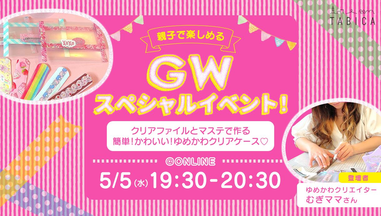 親子で楽しめるGWスペシャルイベント!5/3(月)~5/5(水)開催!▼こんなイベントですGWに様々なジャンルのプロをお招きし、子供たちの好奇心を刺激するような、大人も子供も楽しめるオンラインイベントを開催します!緊急事態宣言や蔓延防止施策が発令される中でも、子供たちにとって何か思い出となるような経験を提供できればと思い、この度開催が決定しました!▼体験内容Tiktokフォロワー33.8万人の大人気ハンドメイドクリエイター【むぎママ】さんによる「クリアファイルとマステで作る、簡単!かわいい!ゆめかわクリアケース♡」なんと今回!!ハンドメイド作品を出品すると1日足らずで完売してしまう大人気クリエイターのむぎママさんが、TABICAのために特別にクリアケースづくりの体験を開催してくれます!むぎママさんと一緒にカワイイ♡ハンドポーチを作り思い出をつくりましょう!▼当日の流れ①ハンドメイドの魅力をむぎママさんが語るよ。今日つくる完成品を見せて工程のご説明をします。②さあ、実際にハンドポーチをつくってみよう♪ オマケに絆創膏もつくるよ! ※質疑応答も随時受け付けます!みなさんの進捗に合わせて作っていきましょう♫③完成品のお披露目会、感想を共有しましょう!▼参加者が準備する道具・材料☆ミニクリアケース☆・A4クリアファイル・マスキングテープ(15mm幅の物)・マグネットタックピース(セリア)またはマグネットテープ(ダイソー) ※1cm×3cmくらいの片面粘着タイプのマグネットを使います。・お好きなシール(あればで大丈夫です)・カッター・カッターマット・30cm定規・目打ち・はさみ☆デコ絆創膏☆・透明絆創膏(ダイソー)※なければ肌色の物でもOK・マスキングテープ(2cm幅以上のもの)・クリアファイル・アルコール除菌・はさみ▼むぎママさんからのメッセージ100円ショップで揃う材料で、かわいいクリアケースを作ります!オマケでかわいい絆創膏も作っていこうと思ってます♡途中まで大人の方にお手伝いしていただけたら、後は小さなお子様でも作れちゃいますよ(^^)なんとコスパは1つ約16円!!お手紙の封筒としてお友達へのプチギフトのケースに絆創膏やシールなどの小物入れにアイデア次第で色々使えると思います☆マステの柄やシールを変えるだけで色々な雰囲気になります!手作りの楽しさを体験していただけたら嬉しいです(^^)▼参加費用1000円▼準備するもの※100円均一で揃います!予約者の方へ後日メッセージを送ります。大人1人500円という表記になっておりますが、1アカウント1予約で大丈夫です^^ぜひご家族でご参加ください!▼GWスペシャルイベントその他ラインナップ●【夜の沖縄美ら海水族館で体験する “サメ” の不思議な世界予約ページhttps://helloaini.com/travels/335165/3(火)19:30-20:30●旭山動物園 坂東園長によるTABICA特別体験!予約ページhttps://helloaini.com/travels/335795/3(月)15:00-16:00●【初心者大歓迎!】プロが1から丁寧に教える、ジオラマ模型製作!予約ページhttps://helloaini.com/travels/335175/4(火)19:30-21:00▼GWスペシャルイベントコンテンツ対象年齢:幼児〜小学生程度の子どもがいる親子※子供向けの内容となっておりますが、大人でも楽しめます!!※幼児未満のお子さんがいる親子も参加可能です▼参加の仕方積極的にチャットを使って質問やコメントなどしていただければ、答えられる範囲で登壇者が答えてくれます^^なるべくイベント中はカメラオンでの参加をお願いしております♪※入退出は自由です。(1)オンライン会議アプリZoom(ズーム)とは米国に本社を置くオンライン会議サービスです。日本でも多くの企業が利用しています。オンラインセミナーでも利用が多く、ゲストは事前登録なく参加することができます。ツールは日本語対応していますのご安心ください。ツールは無料で利用できます。(2)Zoom(ズーム)のダウンロードリンクについてパソコン(PC/Mac)の場合https://zoom.us/download#client_4meeting「ミーティング用Zoomクライアント」をダウンロードしてください。パソコンの場合はアプリのインストールをしなくてもブラウザのみでも参加ができます。iOSアプリ(iPhone/iPad):AppStorehttps://apps.apple.com/us/app/id546505307Androidアプリの場合:GooglePlayhttps://play.google.com/store/apps/details?id=us.zoom.videomeetings