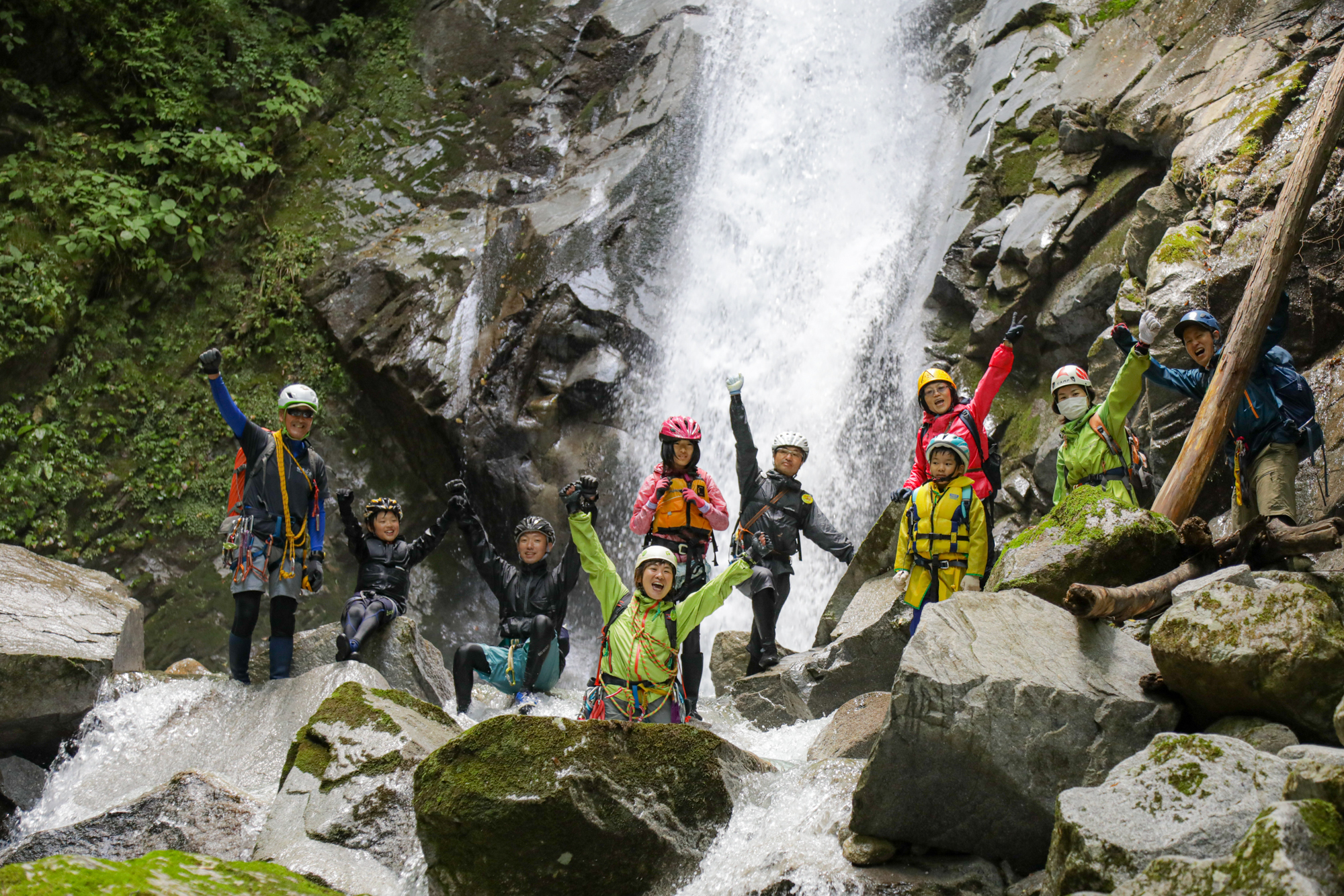 中央アルプスの山麓にある清流、片桐松川。清流の沢を登り!爽快感や達成感を味わう。知る人ぞ知る秘境の滝を探しにいこう!目的地の滝では思わず、大人もこんな「いい笑顔」!