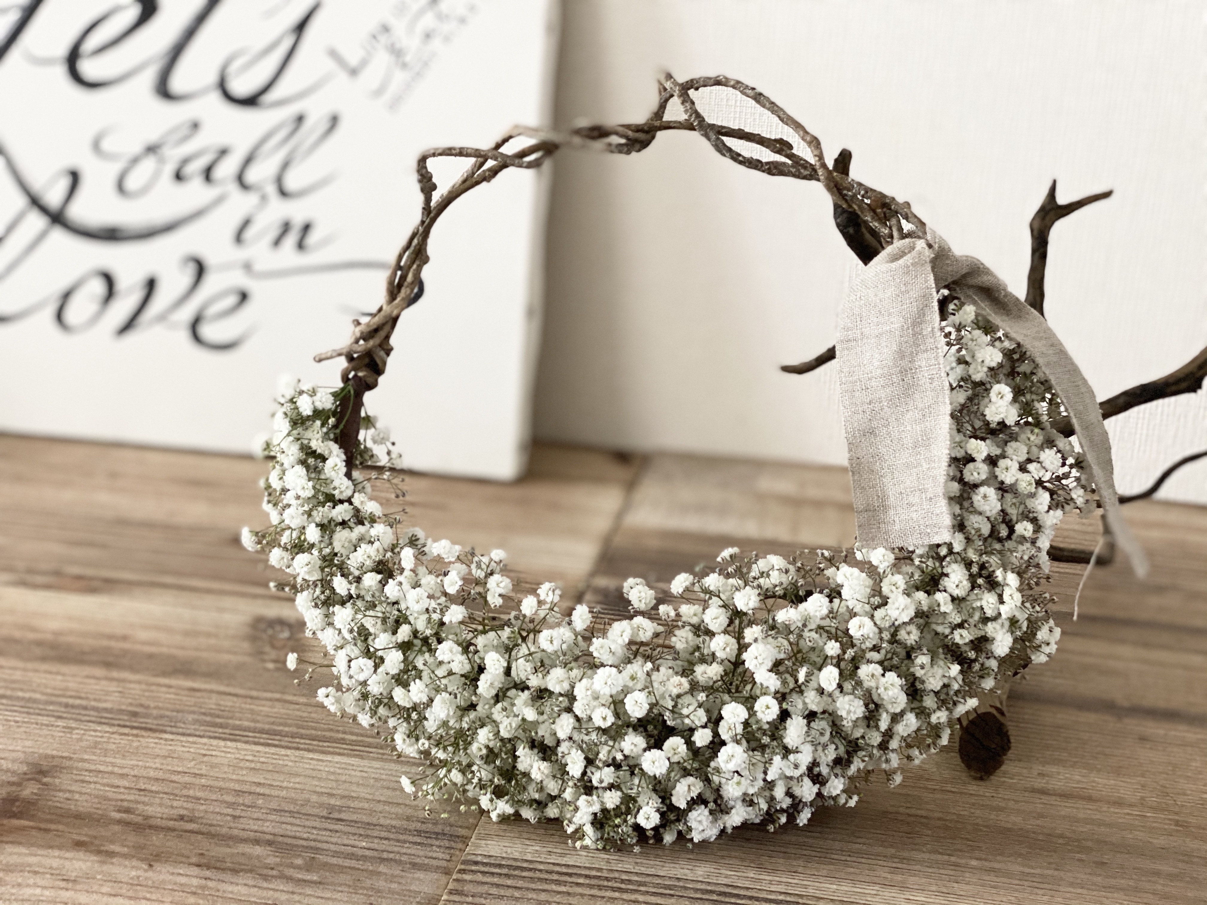 出来上がったかすみ草リースはそのまま飾って頂くとドライフラワーになりますので、その過程もお楽しみ頂き、長く飾って頂くことができます。