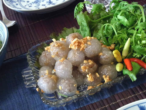 11月は、胃腸に効くハーブと一緒にことこと煮込んだ骨付き肉のトムヤム風味スープと、白ネギをたっぷり食べられる、白身魚とネギのあっさり炒め、それから宮廷料理で有名なものの1つである、豚肉餡のタピオカ包み蒸し、サクー・サイ・ムーを 作ります。
