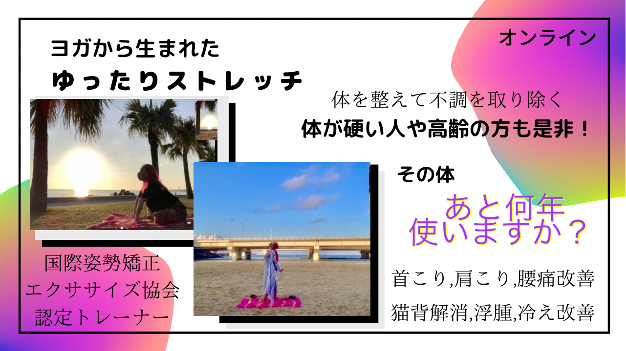 身体の不調を自分で整える!首こり肩こり腰痛は何故繰り返すのか?睡眠の質を上げたい方も是非!zoomのIDは、都度グループメッセージにてお知らせいたします。10分前にはオープンしますので、雑談などしながら体を温めて行きましょう!座った状態からスタートして、四つん這い、うつ伏せ、立ち、壁を使ったストレッチ、ラストは仰向けに寝転んで終わりになります。私のクラスは、決まったポーズをみんなで真似して進める物ではなく、皆様の今の筋肉の状態に合ったそれぞれのペースでご参加頂けます!
